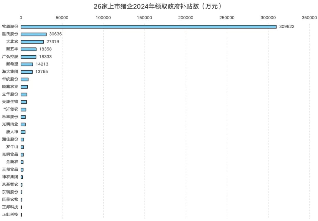 但值得注意的是,同样面临市场寒冬,中小散户与上市猪企的处境却有着天壤之别——后者手握更多政府补贴,得以拥有更强的抗风险能力。数据显示,2024年全国26家上市猪企获得的政府补贴总额达50.58亿元,平均每家企业可获1.95亿元补贴。更显著的是,补贴分配呈现出强者恒强的马太效应,头部企业占据了绝对优势。