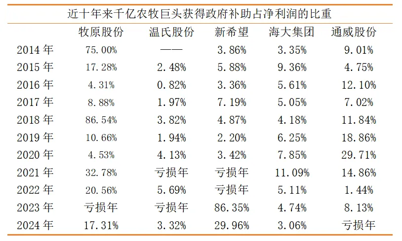 从长期累积来看,2014至2024年五大千亿营收级农牧巨头累计获得补贴超过243亿元,其中牧原股份十年累计获补138.96亿元,通威股份52.91亿元,温氏股份22.98亿元,新希望17.33亿元,海大集团11.57亿元,行业补贴年复合增长率超过20%,但政策红利高度集中于头部企业,与中小养殖户形成鲜明割裂。