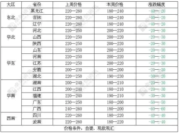 :下跌幅度最为惨烈!广西从 240-260 元 / 头,直接暴跌至 180-200 元 / 头,单头最高跌幅 60 元;广东、福建、四川、云南等省份,价格也全面失守 200 元关口。 ?价格条件:自提、现款现汇