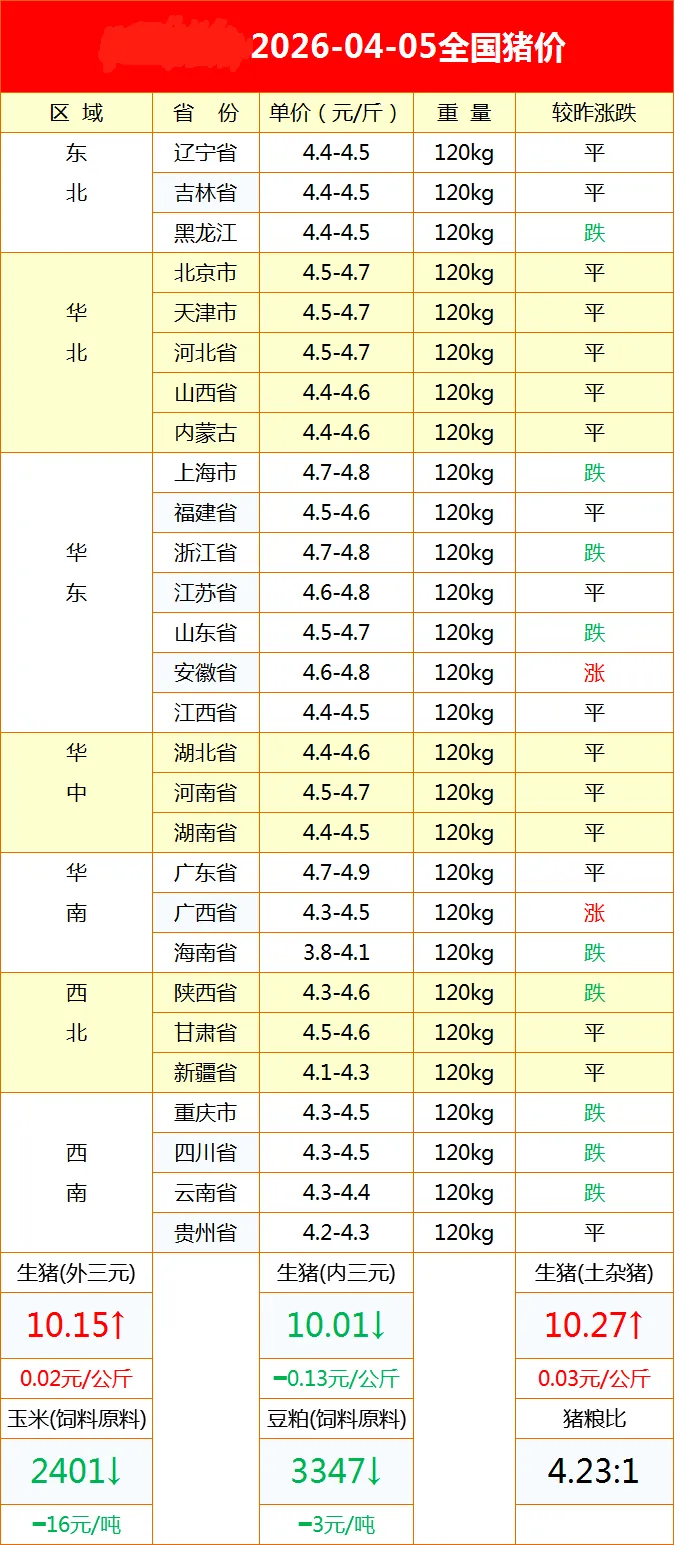 山东慧丰源4月5日猪价行情 养羊网 2026-04-05 山东慧丰源4月5日猪价行情 养羊网 2026-04-05 上一篇:猪价 | 2026.4.5~最新猪价 下一篇:没有了 您可能还会对下面的文章感兴趣111: 相关文章 2025年4月13日全国各地生猪价格信息 3月11日成都鸡蛋价格参考 魔都超火188元沙拉20元轻松复刻?割韭菜 家人们,谁懂啊
