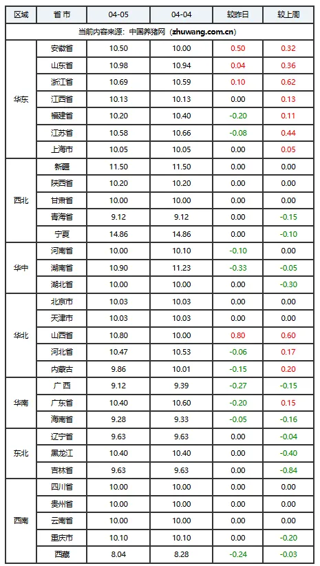 清明小长假第一天猪价略有反弹,但次日便急转直下。截至4月5日,全国生猪平均价格已降至10.12元/公斤,较前一日下滑4.35%,同比跌幅达30.97%。西藏最低价已跌破4.1元/斤,大有逼近3元区间的趋势。