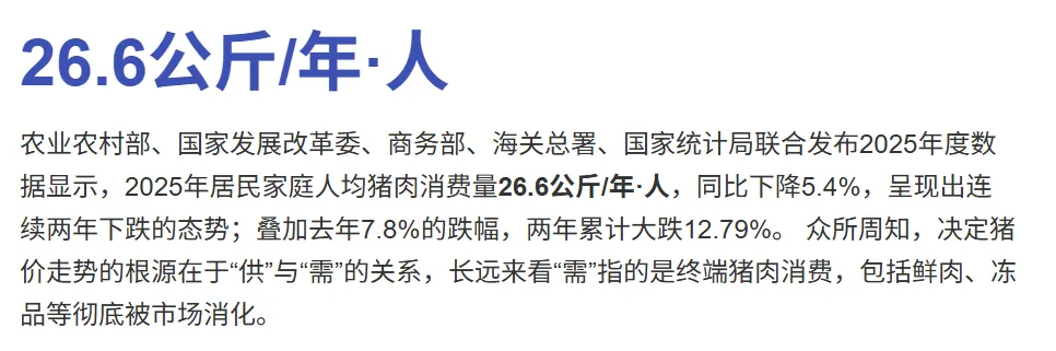 特别是年轻人,越来越注重健康,越来越怕胖,谁还天天大口吃五花肉?数据显示,2025年居民家庭人均猪肉消费量26.6公斤,同比降幅5.4%,猪肉在整个肉类消费中的占比,从2018年的62.1%降到了2025年的57.8%。