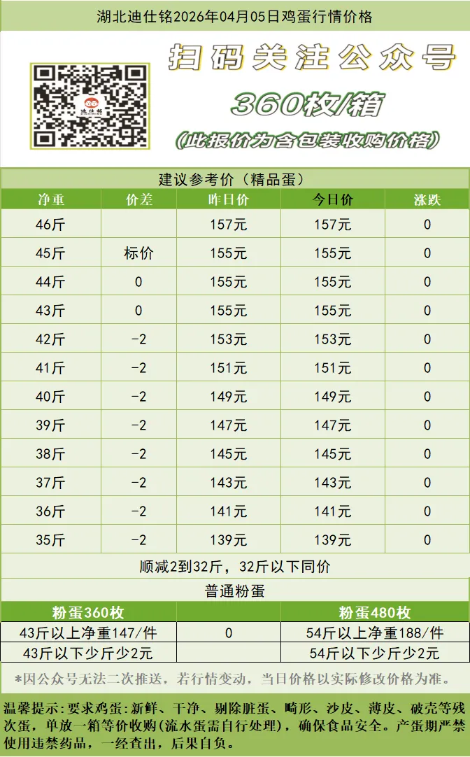 湖北迪仕铭2026年04月05日鸡蛋行情价格 养羊网 2026-04-05 湖北迪仕铭2026年04月05日鸡蛋行情价格 养羊网 2026-04-05 上一篇:2026年4月5日鸡蛋价格分析 下一篇:4月5号 最新鸡蛋价格速查 您可能还会对下面的文章感兴趣111: 相关文章 2025年4月13日全国各地生猪价格信息 蛋碎了 出行游记 | 济州岛4天4夜,?3000有找 近期价格更新!!!