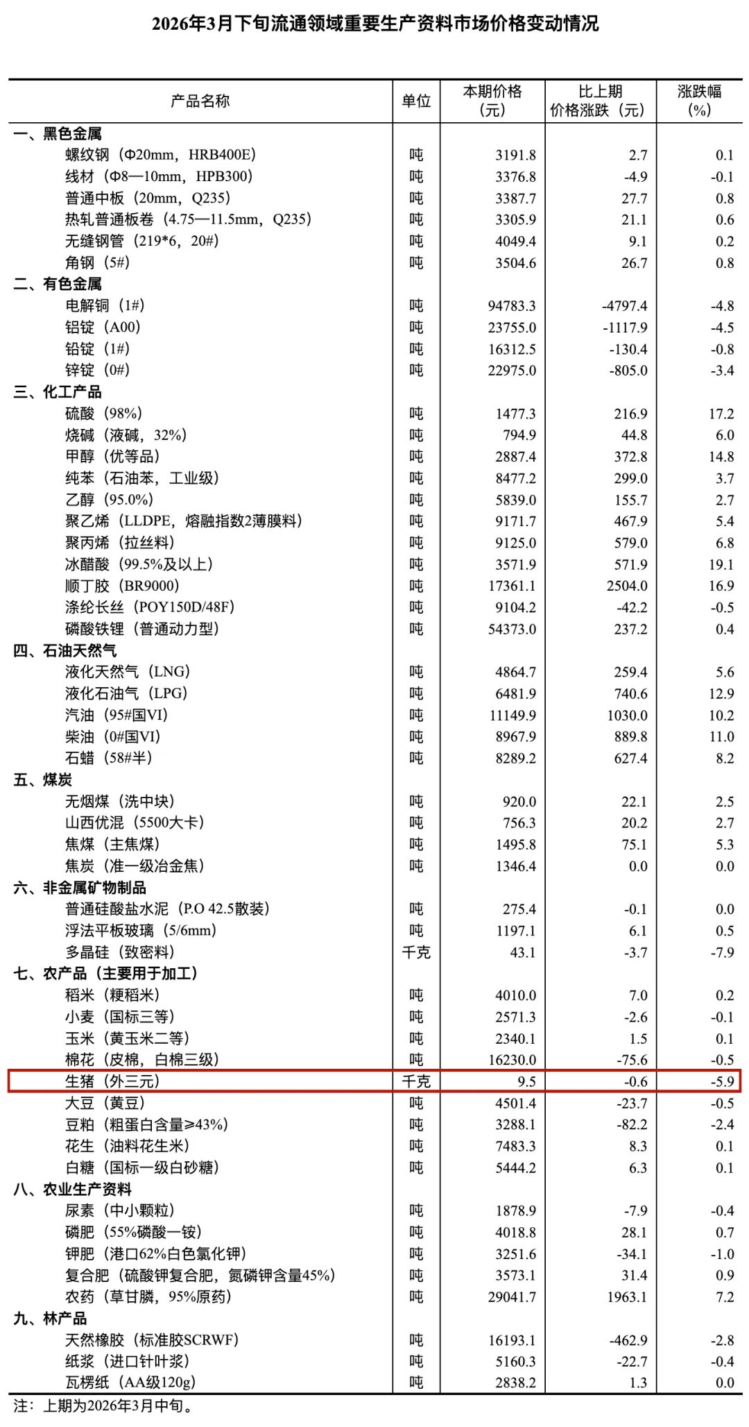 国家统计局4月4日消息,据对全国流通领域9大类50种重要生产资料市场价格的监测显示,2026年3月下旬与3月中旬相比,31种产品价格上涨,16种下降,3种持平。其中生猪(外三元)价格为9.5元/千克,环比下降5.9%。