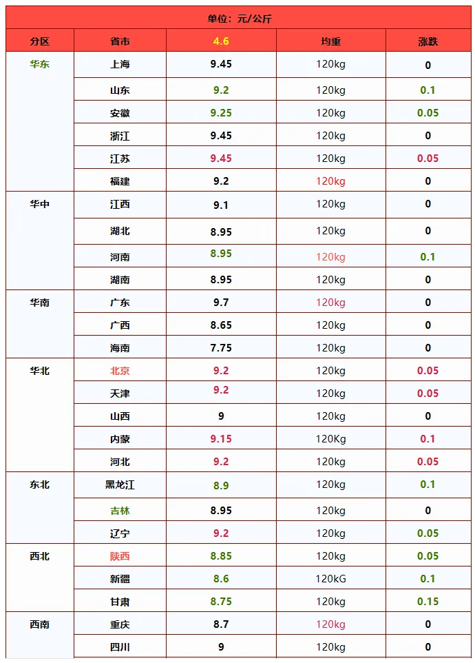从最新报价看,4月6日外三元标猪均价预计在8.95元/公斤,短期仍在震荡下行通道。