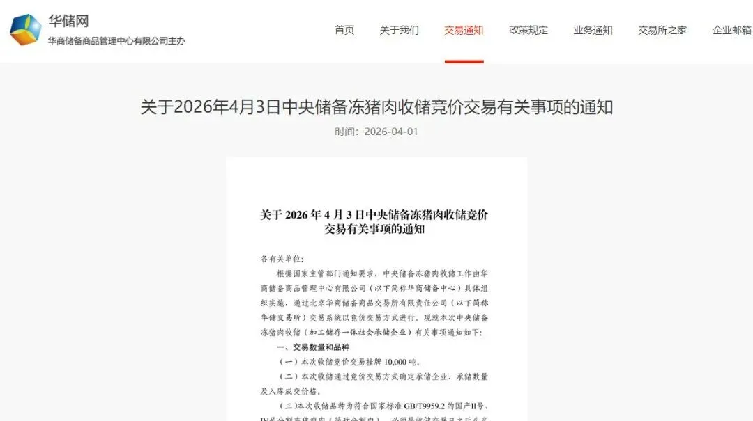 4月2日,商务部官网消息显示,为维护猪肉市场平稳运行,更好发挥中央储备调节作用,近期商务部、国家发展改革委、财政部正在开展中央储备冻猪肉收储工作。前一日,华储网发布《关于2026年4月3日中央储备冻猪肉收储竞价交易有关事项的通知》,本次收储挂牌竞价交易1万吨。