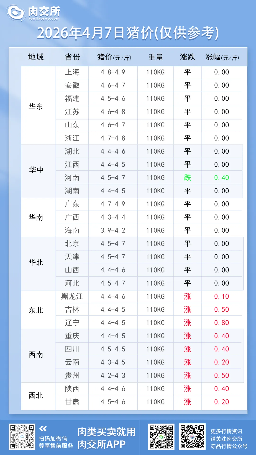 吉林、贵州涨 0.5 元 / 斤,河南跌 0.4 元 / 斤,重庆、四川、陕西涨 0.4 元 / 斤; - 普涨阵营