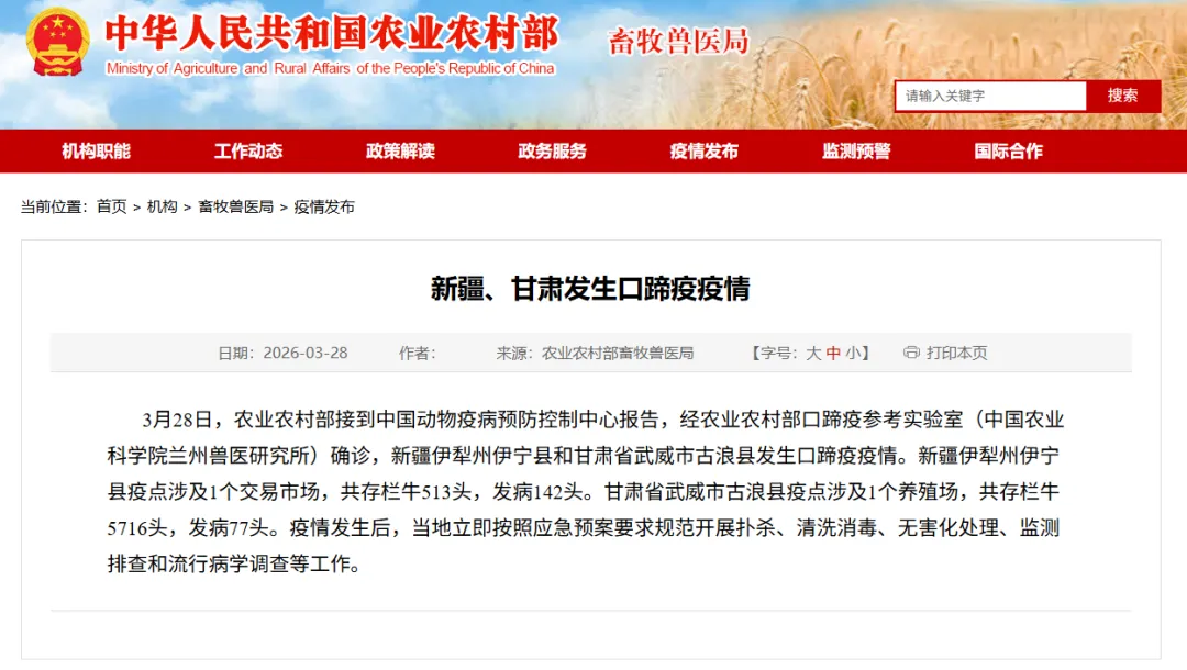 牛价上涨的直接导火索是南非 1 型口蹄疫疫情的传入。2026 年 3 月底,新疆、甘肃等地牛群出现疫情,该病毒传染性与危害性更强,犊牛、怀孕母牛风险高,易引发流产。