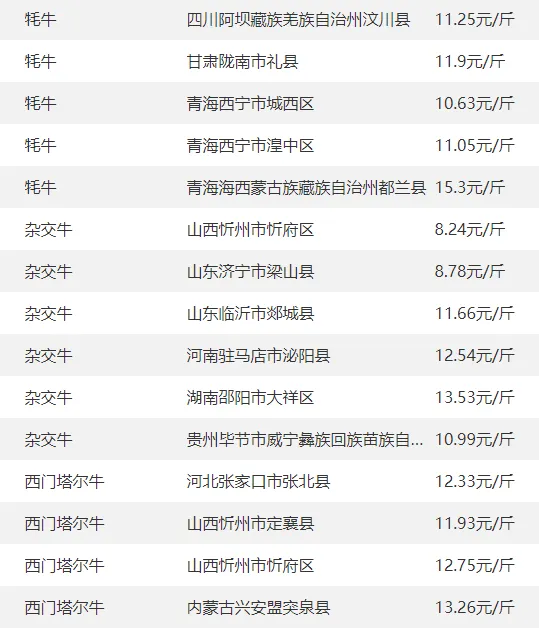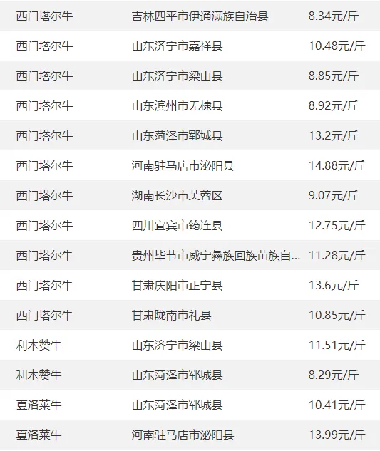 1、活牛:全国主产区均价13.46-13.5元/?斤(26.9-27.0元/公斤),稳中偏强。北方13.5-14.8元/?斤,优质西门塔尔14.8?元/?斤以上;南方18.5-19.0?元/?斤。