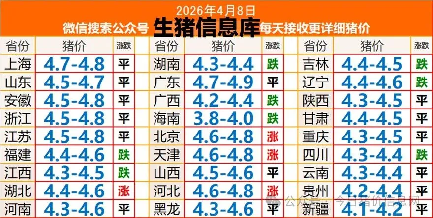 猪价26.04.08 养羊网 2026-04-07 猪价26.04.08 养羊网 2026-04-07 上一篇:养羊警惕"过料":粪便带料、干吃不长,这样调理最有效! 下一篇:猪价下跌无休止,4元关口告急!一边是巨头拿补贴扩产,一边是散户被“清场”,出路在哪? 您可能还会对下面的文章感兴趣111: 相关文章 2025年4月13日全国各地生猪价格信息 1月5日云南昆明鸡蛋价格参考 2025年4月13日全国各地生猪价格信息 685一克金豆要抓紧下手吗!?
