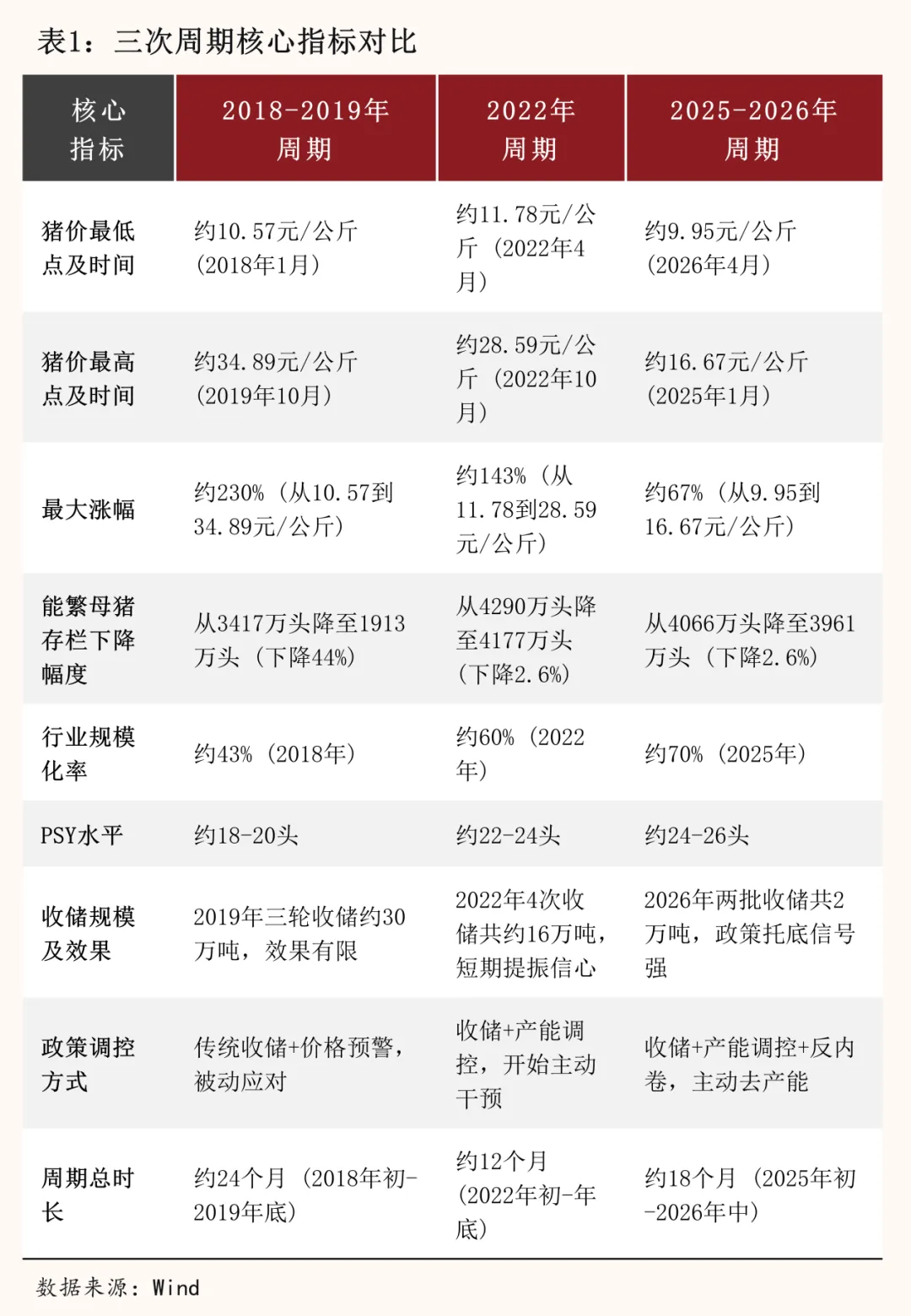 要理解本轮周期的特殊性,有必要将其与2018-2019年非洲猪瘟周期、2022年收储后的反弹周期进行对比,从中找出本轮周期的“新规律”和“异变点”。