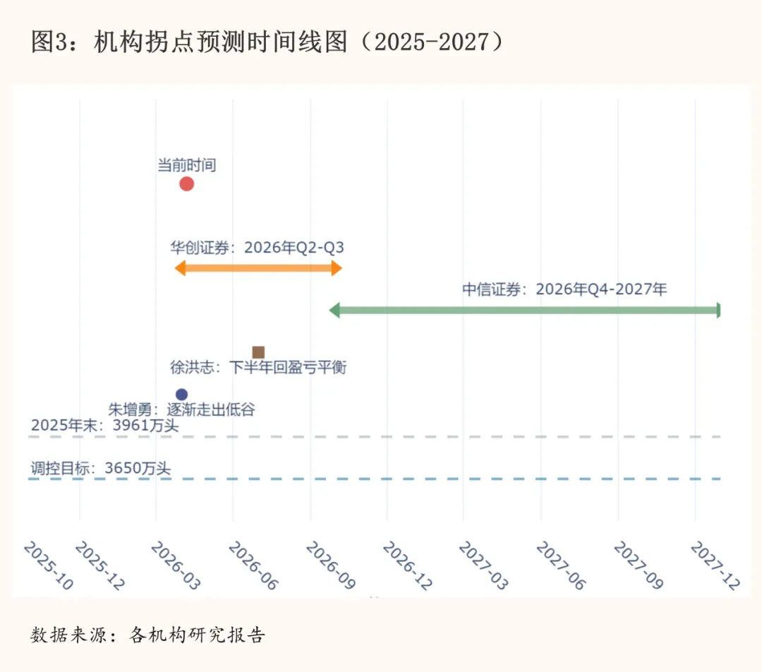 国金证券给出了更明确的量化标准:若能繁母猪存栏降至3650万头红线,供应收缩,猪价有望迎来实质性上涨,周期拐点显现。东兴证券则强调,2026年生猪产能去化将逐步深化,静待周期拐点。