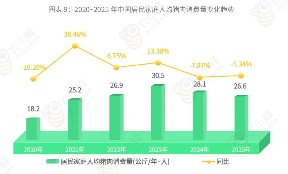 来自国家统计局的数据直观显示,我国居?家庭?均猪?消费量已在2024-2025年出现连续两年的下降趋势。
