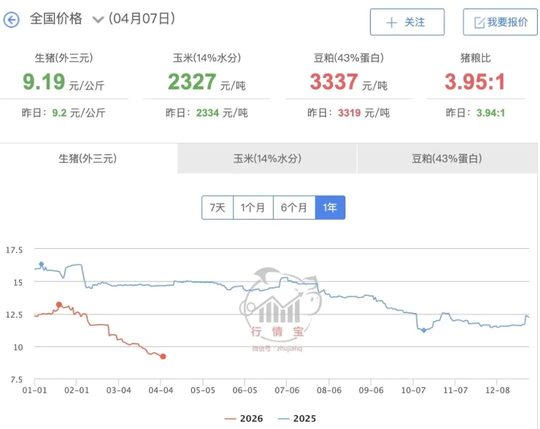 而据行情宝的最新数据显示,今日(4月7日),全国生猪(外三元)平均价格来到9.19元/公斤,其中,海南生猪价格更是跌至7.57元/公斤的历史极值,出现明显的“菜比肉贵”的结构性现象。
