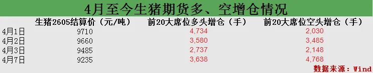 以持仓量排名前20位的期货公司席位为例,在过去的几个交易日里,多头增仓力度甚至要大于空头。比如4月1日,前20名期货公司席位多头增仓4734手,当日空头则增仓2030手,同时3月2日、3月3日以上席位多头增仓数量也要略多于空头,直至4月7日空头增仓数量才反超多头。