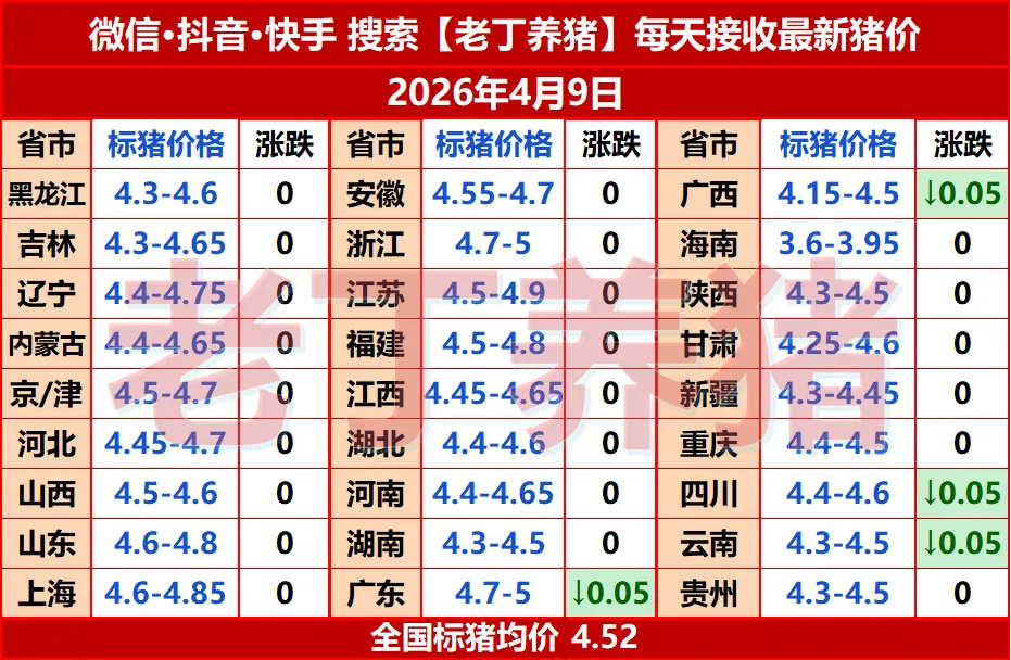 猪价有变!【明天猪价】4月9日全国猪价涨跌表! 养羊网 2026-04-08 猪价有变!【明天猪价】4月9日全国猪价涨跌表! 养羊网 2026-04-08 上一篇:猪价跌到近20年极端低位时,不敢下注的人,和三年后拍大腿的人,往往是同一批人 下一篇:猪价跌破5元,头部猪企却在闷声赚钱!这轮“非典型”猪周期的投资逻辑变了 您可能还会对下面的文章感兴趣111: 相关文章 2026.2.3-明日猪价(牛气冲天,猪价又是满堂红!) 厦门帮婆婆卖几十个土鸡蛋 2025年4月13日全国各地生猪价格信息 【超前猪价大预测】3月25日~3月27日!全国猪价!