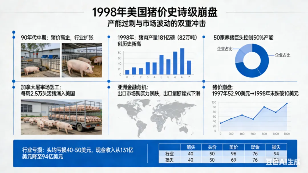 猪价持续探底,我们有幸看到了历史最低的猪价,回溯美国的1998年,猪价探底历史最低,我们可以通过看美国的版本,预先感知我们国家生猪养殖业的未来,会是一个什么样的状态。