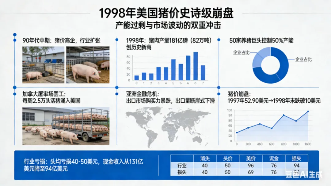 猪价从1997年的52.90美元暴跌至1998年末的不足10美元,行业头均亏损达40-50美元,现金收入从131亿美元锐减至94亿美元。