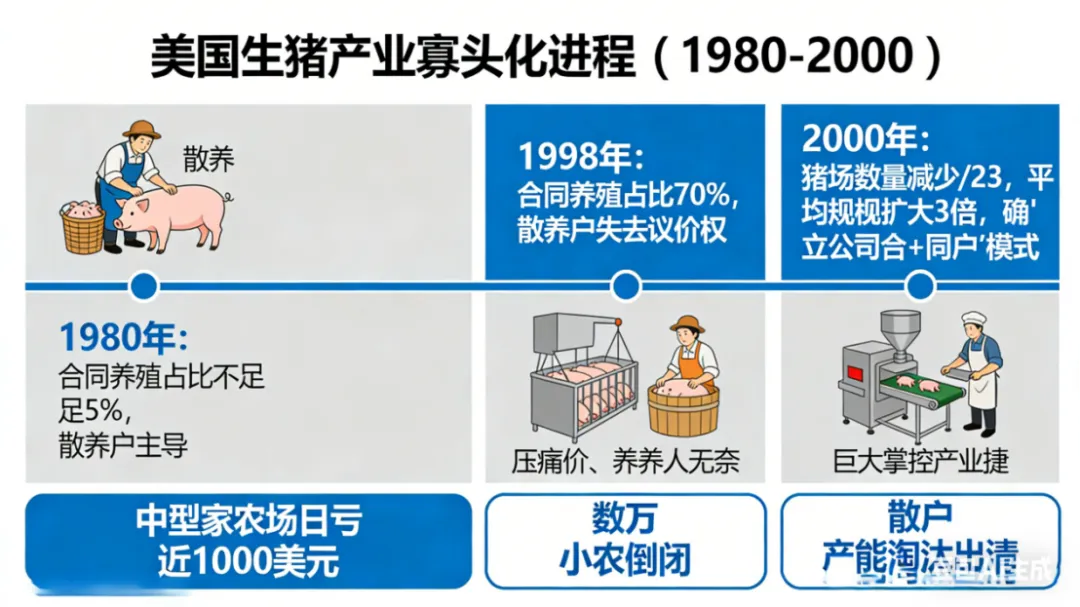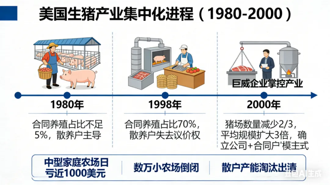 美国生猪产业在价格崩盘后经历了深刻的变革。1980年,合同养殖占比不足5%,散养户主导市场;到1998年,合同养殖占比已升至70%。