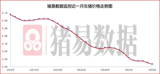 据猪易数据监测数据显示,2026年4月08日标准体重生猪平均价格为8.86元/公斤,较昨日猪价下跌0.04元/公斤,跌幅0.45%,同比25年同期14.60元/公斤下跌5.74元/公斤,跌幅39.32%。