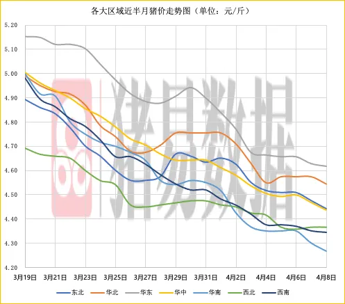 东北、华北、华中、华东、西南、华南地区猪价呈现下跌,西北地区猪价呈现稳定,生猪平均价格微幅下跌。