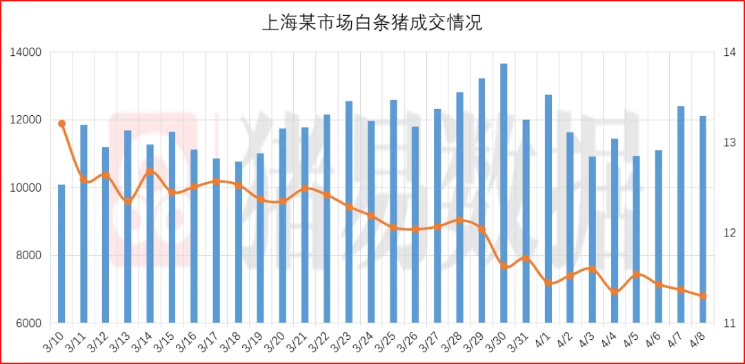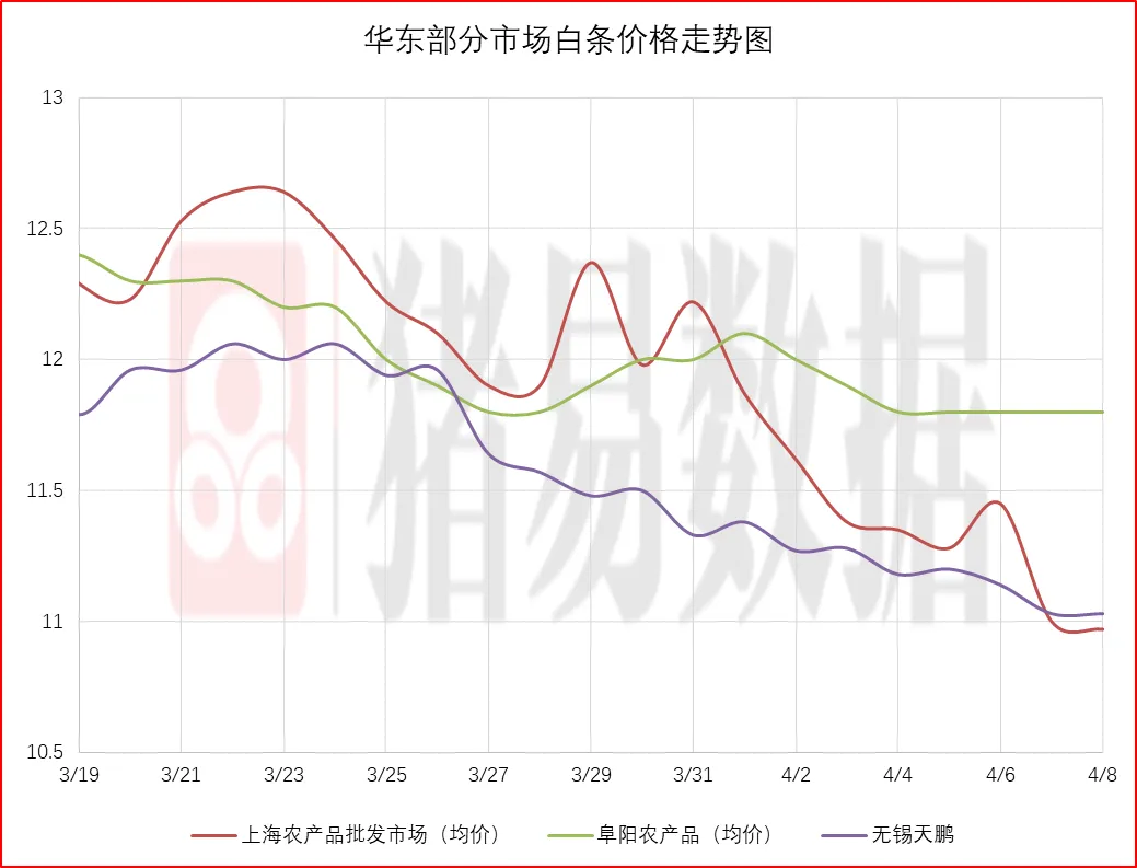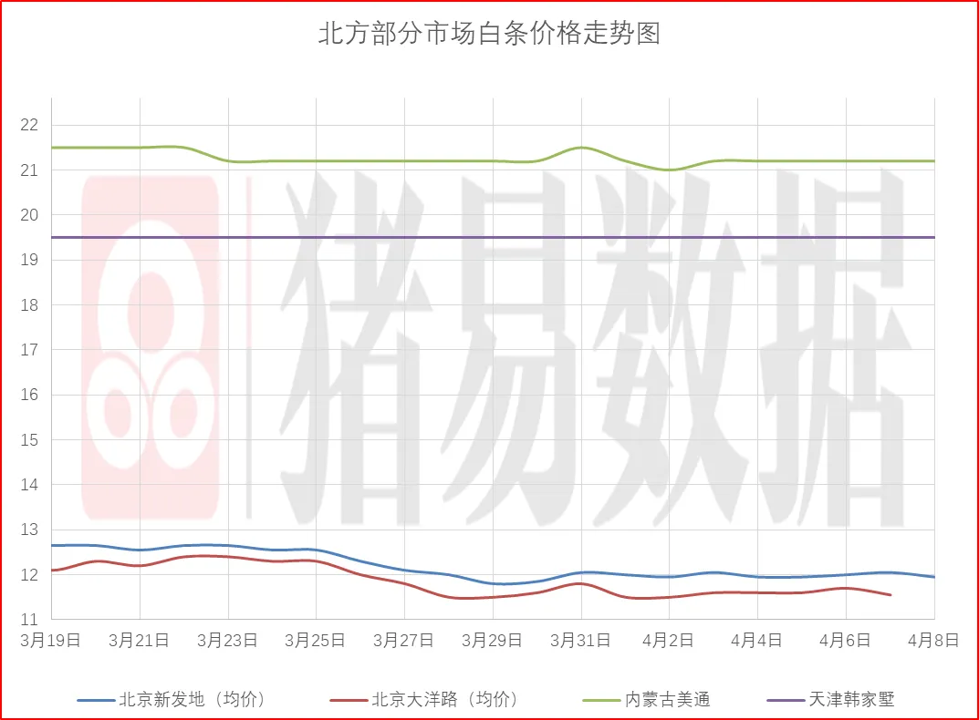从今日北京、上海消费城市批发市场白条价格走势来看,北京、上海批发市场白条开磅价格呈现跌涨调整,北京大部分市场开磅价格维持稳定,市场走货速度表现一般;上海市场价格呈现下跌,部分市场成交价参考10.97-11.3元/公斤,到货量表现有所减少,市场交易情况表现偏差,市场成交均价表现偏差。