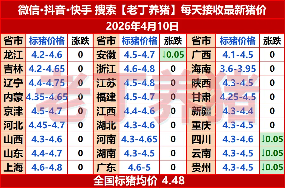 猪价何时上涨?【明天猪价】4月10日全国猪价涨跌表!关注老丁养猪