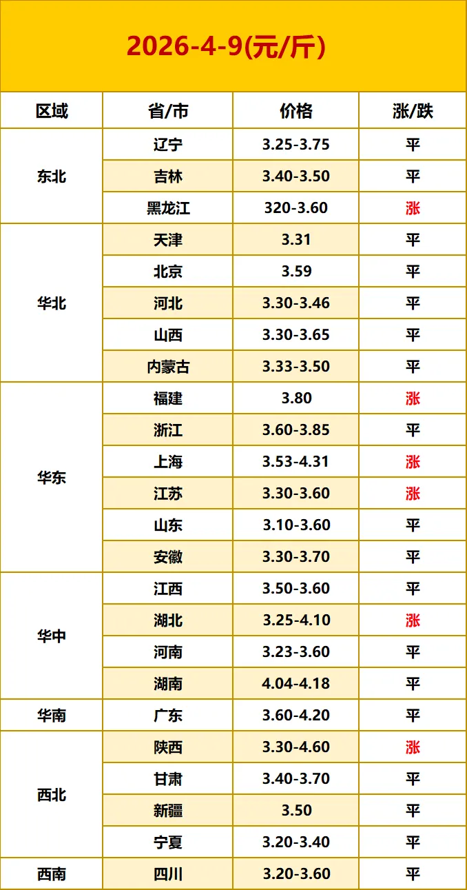 2026.4.9 今日鸡蛋价格 养羊网 2026-04-09 2026.4.9 今日鸡蛋价格蛋价日评:今日鸡蛋价格稳定。产蛋鸡存栏偏高、供应充足,随着蛋价贴近养殖成本,饲料成本对价格形成底部支撑。终端需求转淡,叠加猪肉价格偏弱带来明显替代效应,蛋价面临回调压力。预计近期鸡蛋价格震荡调整。以上报价仅供参考! 养羊网 2026-04-09 上一篇:广西稳定!4月9日南宁鸡蛋参考价格:稳中偏强! 下一篇:今日鸡蛋价格(2026.4.8) 您可能还会对下面的文章感兴趣111: 相关文章 2月9日东莞信立农批鸡蛋价格 猪价下跌! 2025年4月13日全国各地生猪价格信息 猫粮成本真的那么高吗???