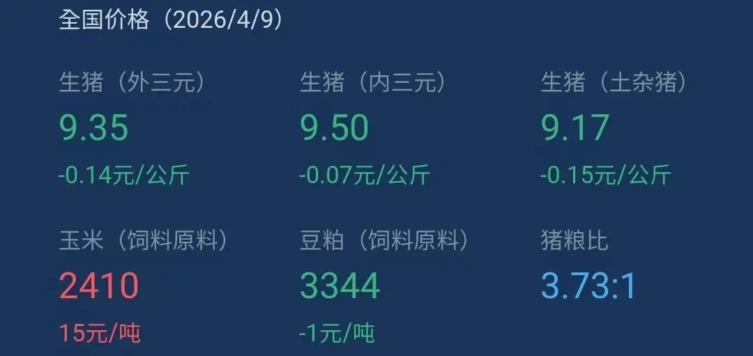 一、今天(2026年4月9日)全国生猪标准体重平均价格9.0-9.6元/公斤,同比昨日(2026年4月8日)价格上涨跌0.05元/公斤。