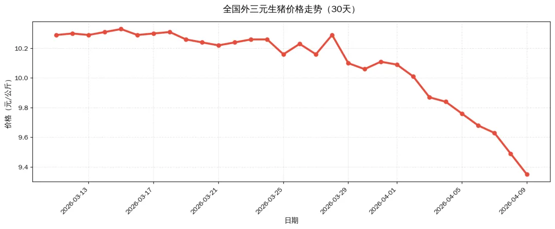 外三元 9.35 ↓0.14元/公斤 | 内三元 9.50 ↓0.07元/公斤 | 土杂猪 9.17 ↓0.15元/公斤 |