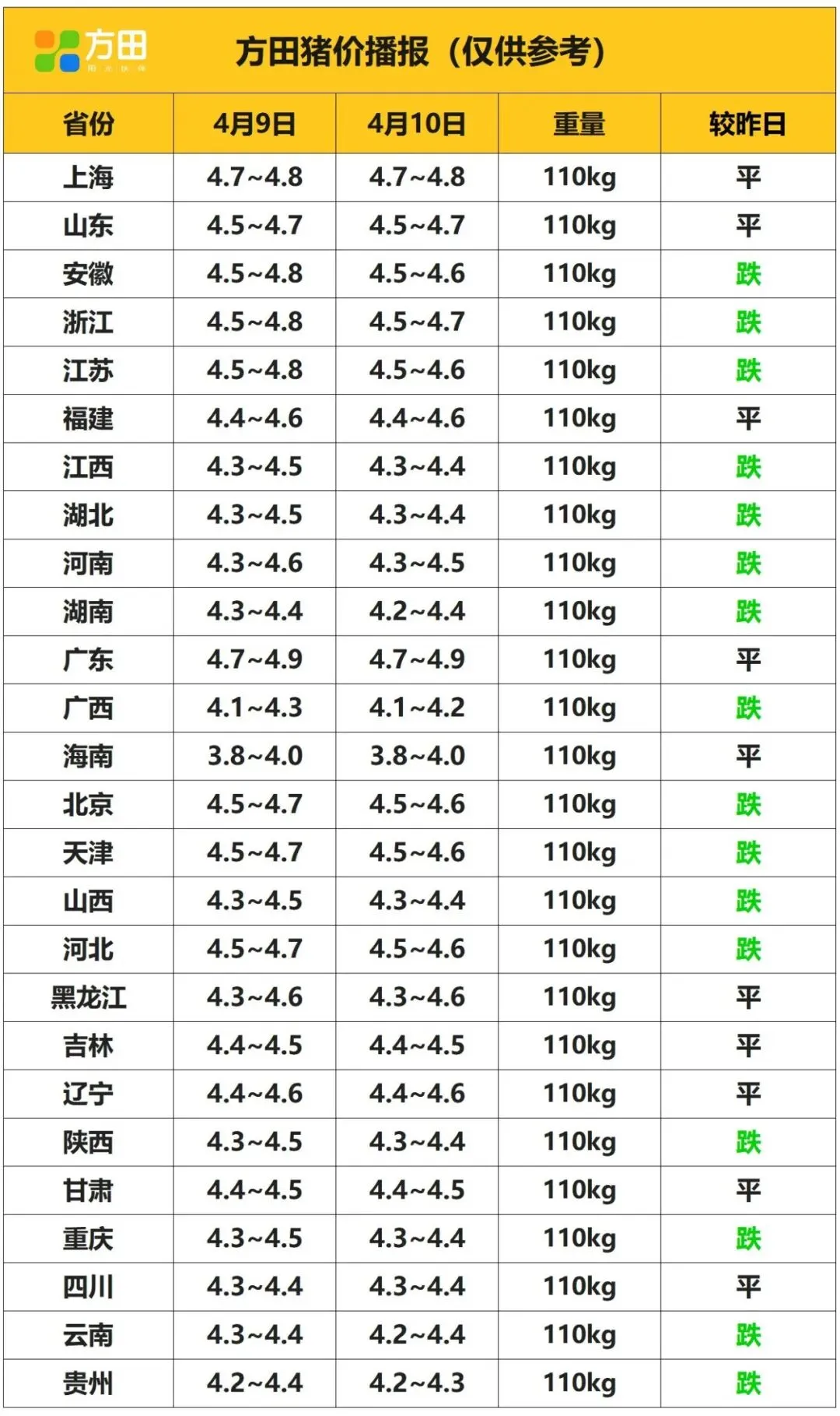 猪价丨4月10日 明日猪价早知道 养羊网 2026-04-09 猪价丨4月10日 明日猪价早知道 养羊网 2026-04-09 上一篇:猪价马上就要涨!!! 下一篇:猪价跌、股价涨,背后逻辑是什么? 您可能还会对下面的文章感兴趣111: 相关文章 2026.2.18明天猪价(附:广东温氏最新生猪报价) 当养猪人都在赌下半年涨价,猪价真会涨吗?三大隐藏风险曝光! 趣玩儿羊圈 2025年4月13日全国各地生猪价格信息