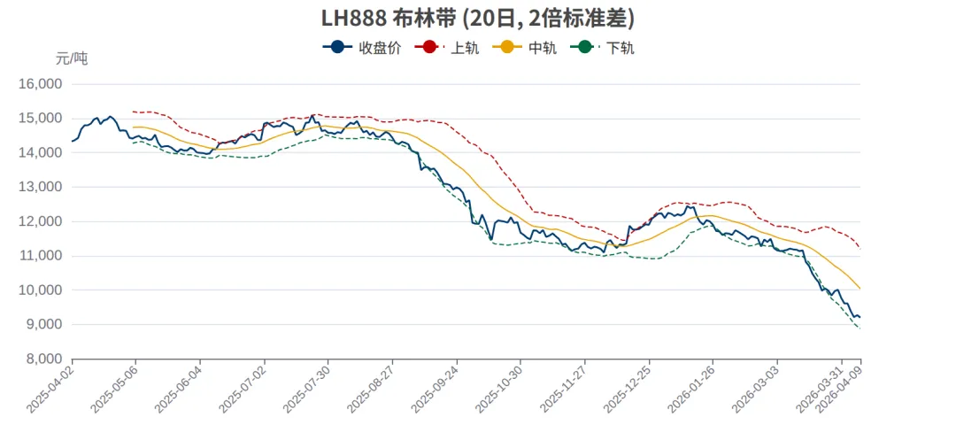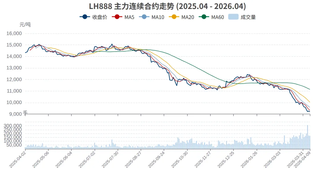 上图展示了LH888主力连续合约过去一年的日K线走势。价格从2025年4月的14,300元/吨附近一路下行,期间仅在2025年7月(15,085元/吨)和2025年11月(12,440元/吨)出现过两次短暂的反弹。进入2026年后,跌势进一步加速——1月失守12,000元/吨关口,2月跌破11,000元/吨,3月更是击穿10,000元/吨的整数支撑位,4月7日更是盘中触及9,125元/吨的历史新低,4月9日收于9,195元/吨。均线系统呈完全空头排列(MA5 < MA10 < MA20 < MA60),短期内趋势性反转的概率较低,但极度超卖的技术指标暗示超跌反弹随时可能发生。