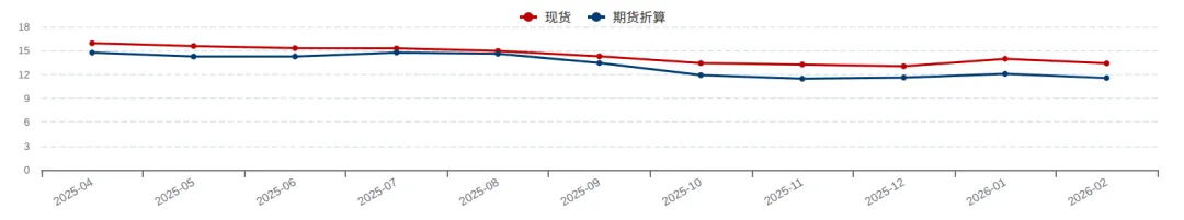 从涨跌幅度来看,LH888近1个月累计下跌15.8%,近3个月下跌20.8%,近6个月跌幅更是高达30.6%。这种加速下跌的态势反映了三重压力的叠加:一是2024年下半年扩产的能繁母猪陆续进入产能兑现期,二是春节后猪肉消费季节性回落,三是市场悲观情绪自我强化导致的期货溢价压缩。值得注意的是,期货价格9,195元/吨(4月9日收盘,折合约9.27元/公斤)已大幅低于活猪现货价格13.38元/公斤,贴水幅度约31%——这一异常深度的贴水结构,既体现了市场对后市的极度悲观预期,也为潜在的反弹积蓄了空间。