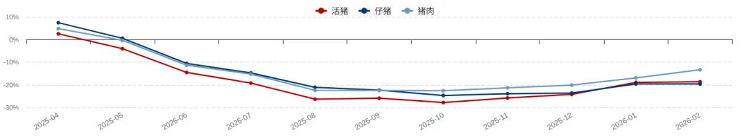 仔猪价格是产业链的先行指标。当前仔猪价格29.35元/公斤,较2025年4月高点38.18元/公斤下降23.1%,但仍高于2019年猪瘟后的低点。仔猪价格的下降反映了养殖户补栏意愿的减弱——在当前深度亏损的背景下,新增补栏动力不足,仔猪需求走弱。但值得注意的是,仔猪价格的降幅(23.1%)小于活猪价格的降幅(同比-18.7%的基础上进一步下滑),这可能反映了养殖户对未来猪价反弹的某种残留期待,或者是仔猪供给端同步收缩的结果。