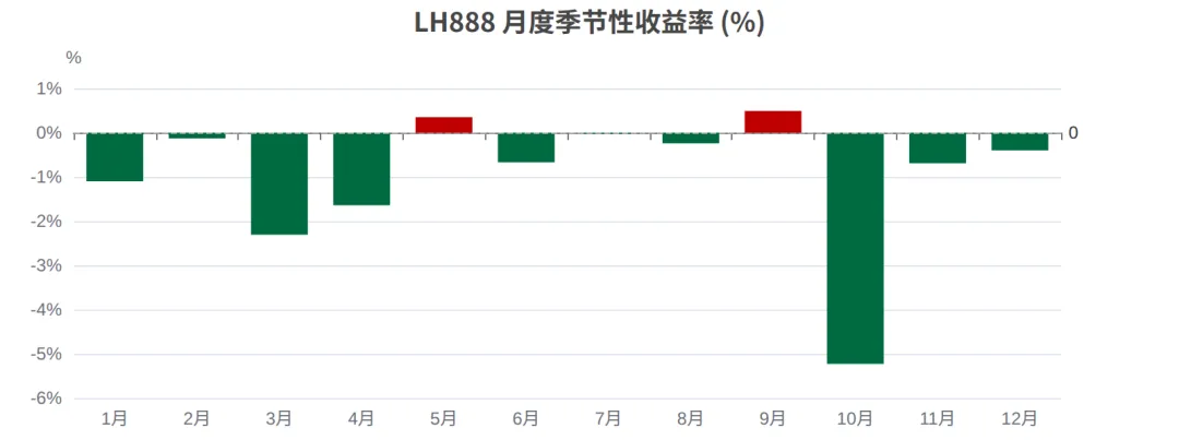 需要注意的是,下方图表的月度收益率统计基于LH888主力连续合约(2021年上市至今),样本年份有限,与生猪现货的长期季节性规律存在差异。特别是期货合约的10月收益率可能受到限仓、交割月换月、以及合约上市初期流动性不足等因素干扰,不完全反映现货季节性。因此,季节性分析应以现货长期规律为主要参考,期货月度收益率数据为辅助参考。