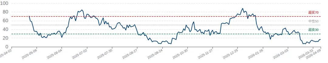 多项动量指标显示LH888处于极度超卖状态。RSI(14)读数仅16.18,处于20以下的"极端超卖"区域。回顾LH合约的历史,RSI低于20的情况非常罕见,过去出现类似极端超卖后,价格在随后的2-4周内均出现了不同程度的技术性反弹,平均反弹幅度约5%-8%。