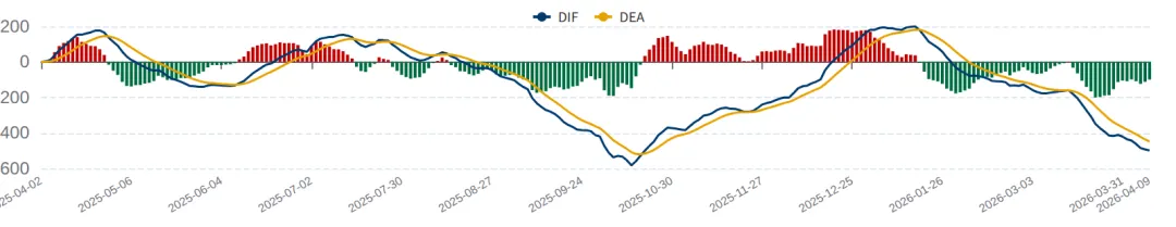 MACD指标同样处于深度空头区域。DIF(-461.97)位于DEA(-407.44)下方,MACD柱状图为-109.06且持续为负,尚未出现明显的收窄迹象——空头动能仍在释放中。需要观察后续MACD柱状图是否出现连续3日以上的收窄趋势,这将是下跌动能衰减的早期信号。在此信号出现之前,MACD维持偏空判断。