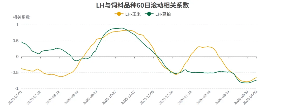 从LH与饲料品种的相关性来看,近60个交易日LH与玉米(C)的滚动相关系数为-0.754,与豆粕(M)的相关系数为-0.802。负相关性反映了"饲料涨→成本压力→猪价跌"的传导逻辑——当饲料价格上涨时,养殖成本上升叠加养殖户恐慌性出栏(为降低饲料消耗),导致猪价承压。这种负相关在养殖亏损期尤为显著,而在养殖盈利期可能转为正相关(猪价涨→补栏→饲料需求增→饲料涨)。