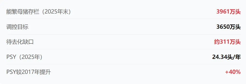 2025年末能繁母猪存栏3961万头,而农业农村部最新调控目标已下调至3650万头——缺口仍有311万头。