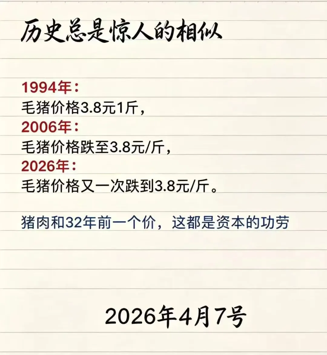 有人说,猪价回到了多年前的水平。还贴出了多年前的猪价:1994年,猪价3.8元/斤。 广大集团和养殖户努力了32年,终于把猪价卷到32年前的水平了。 养猪人欲哭不能,1994年的3.8元能和现在比么?那是个各种生活物资都比较稀缺的年代。再早几年,那时候的有钱人叫“万元户”,现在动不动几个小目标起。 那个时候我上小学,1元钱就能买相当多的零食了。 最近,各大养猪巨头纷纷公布了2026年3月的销售简报,数据一出,整个行业都陷入了沉默。根据最新数据显示,头部养猪上市企业的商品猪/肉猪出栏均价普遍集中在9.7–10.1元/公斤区间,整体处于低位运行状态,可以说,集体破十了。 具体如下: 牧原股份:9.91元/公斤,(商品猪均价),销售收入同比下降32.73%(牧原是真去产能啊) 温氏股份:10.11元/公斤,毛猪均价,环比下降12.99%; 新希望:9.74元/公斤,商品猪均价,环比下降14.93%; 大北农:9.87元/公斤,育肥猪均价,显著下降; 巨星农牧:10.10元/公斤,商品肥猪均价,显著下降; 神农集团:9.82元/公斤,商品猪均价,环比下降12.32%; 立华股份:10.32元/公斤,肉猪均价,环比下降14.57%; 东瑞股份:10.94元/公斤,商品猪均价,环比下降11.09%(因供港业务占比高,价格略高) 市场行情显示,3月猪价延续了春节后的下跌趋势,头部企业均价环比降幅普遍超过10%,同比降幅更是高达30%左右。当前9.7–10.1元/公斤的价格已接近甚至跌破部分企业的养殖成本线,行业整体处于亏损或微利状态。 养殖户们纷纷调侃:"别人养猪为致富,我养猪是为消费者做公益。" 历史低猪价回顾:30年前的相似剧本 翻开历史的账本,这种低迷的猪价并非首次出现。让我们把时光机调回30年前,看看那些年我们经历过的猪价"寒冬"。 1994年:粮食流通体制改革导致饲料成本大幅上涨,而散户养殖为主的市场结构缺乏抗风险能力。那一年,毛猪价格跌破4元/斤,换算成,最低3.8元。 当时市场环境表现为疫病防控薄弱,信息不对称严重,"谷贱伤农"的现象屡见不鲜。 2006年:能繁母猪存栏同比增长8.2%,产能严重过剩。同时,玉米价格上涨17.6%,成本压力倍增。全年均价12.5元/公斤,后来,蓝耳病疫情席卷全国,引起了散户退出率高达30%。那场疫情不仅让无数养殖户血本无归,也给整个行业敲响了警钟。 有趣的是,无论是1994年还是2006年,猪价下跌的背后都藏着相似的剧本:产能过剩+需求疲软+成本上升。历史总是惊人地相似,但不会简单重复。正如一位老养殖户所说:"猪周期就像四季轮回,春天总会再来,但等待的过程往往漫长而痛苦,尤其是这次。" 当前猪价会否刷新下限? 面对当前9.7–10.1元/公斤的低价,市场最关心的问题是:猪价会不会再次刷新历史下限?让我们从三个维度来分析: 产能过剩:2026年3月,全国能繁母猪存栏量约3960万头,明显高于均衡水平(3750-3800万头)。虽然3月去化速度加快(减少0.34%),但距离发改委要求的3650万头目标仍有差距。产能去化不到位,价格反弹就缺乏基础。 政策调控:发改委已明确要求将能繁母猪存栏调减至3650万头,同时启动储备肉投放与养殖补贴政策。这些措施短期内可能加剧市场供应压力,但中长期有利于行业健康。 成本压力:饲料成本因原油价格上涨增加15%,自繁自养模式已连续亏损8周,每头猪亏损超300元。这种情况下,中小养殖户的退出速度将加快,产能去化有望加速。 专家预测:中原证券研报认为,2026年四季度或迎来猪价上涨周期,2027年价格有望升至15-16元/公斤。生猪期货主力合约价格虽创历史新低(9180元/吨),但已开始反映未来预期。 猪周期的轮回与启示 猪价回到了30年前。这个笑话一点都不好笑,因为它背后是无数养殖户的辛酸和整个行业的阵痛。