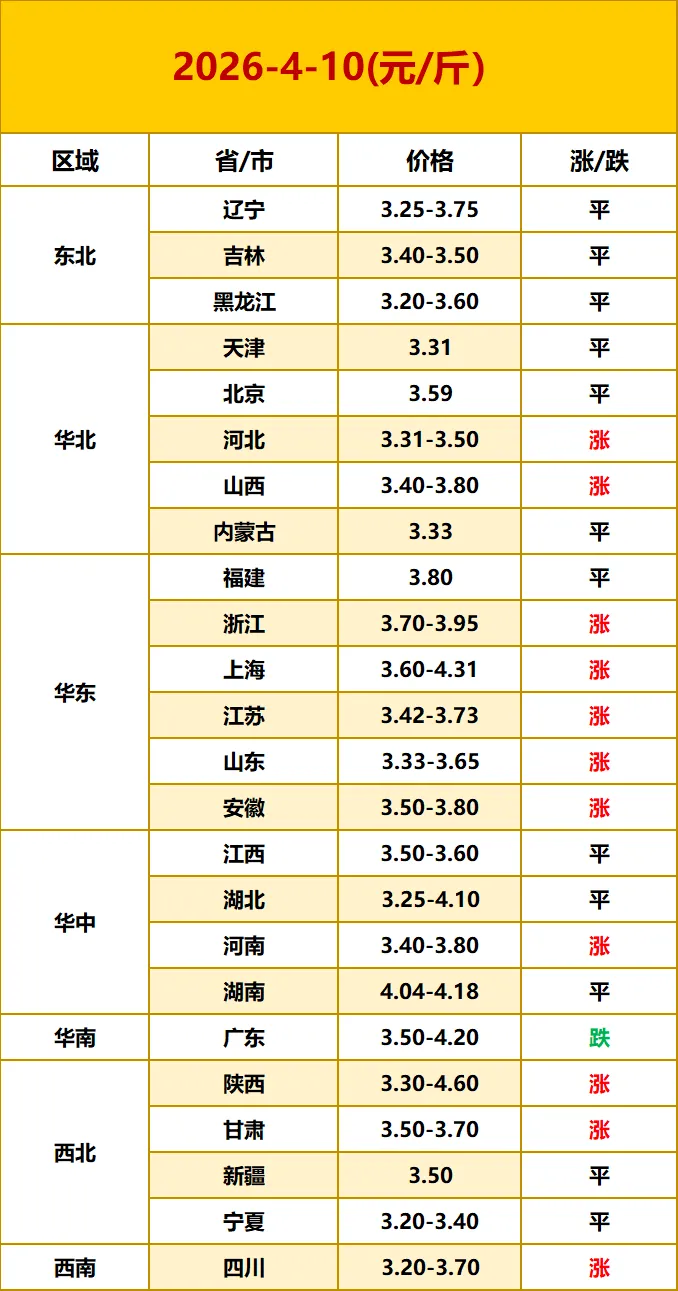2026.4.10 今日鸡蛋价格 养羊网 2026-04-09 2026.4.10 今日鸡蛋价格蛋价日评:今日鸡蛋价格上涨。产蛋鸡存栏偏高、供应充足,随着蛋价贴近养殖成本,饲料成本对价格形成底部支撑。终端需求转淡,叠加猪肉价格偏弱带来明显替代效应,蛋价面临回调压力。预计近期鸡蛋价格震荡调整。以上报价仅供参考! 养羊网 2026-04-09 上一篇:猪价四块多26.04.10 下一篇:猪价跌到每公斤10元!卖一头亏400元? 您可能还会对下面的文章感兴趣111: 相关文章 近期价格更新!!! 帮妈妈卖鹅蛋!鸡蛋! 节前猪价“不涨反跌”!12元是开始?养殖户警惕三大“隐形杀手” 2025年4月13日全国各地生猪价格信息