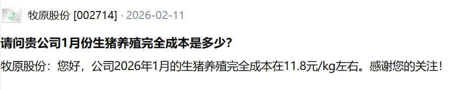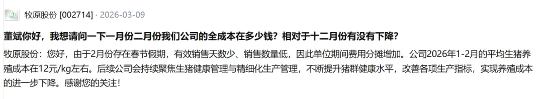 二是关于牧原的成本,由于2月份过年,出栏量相比其他月份下降不少,导致费用分摊增加,数据失真,当前成本暂且按照11.8元/公斤计算。