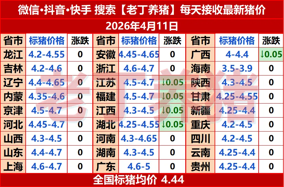 猪价有变!【明天猪价】4月11日全国猪价涨跌表! 养羊网 2026-04-10 猪价有变!【明天猪价】4月11日全国猪价涨跌表! 养羊网 2026-04-10 上一篇:猪价10年新低,2500亿的牧原股份值得投资吗? 下一篇:猪价延续横盘偏弱的走势!京津冀地区4月10日猪价早知道 仅供养猪人学习参考,不构成投资意见.#明日 #行情 您可能还会对下面的文章感兴趣111: 相关文章 近期价格更新!!! 2025年4月13日全国各地生猪价格信息 放量突破,橡胶可以追多吗? 近期价格更新!!!