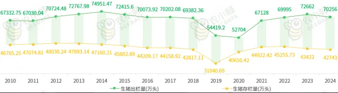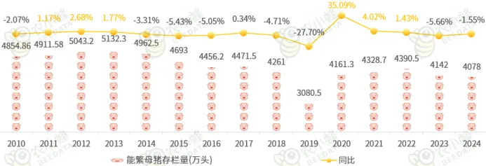 根据《2025年中国肉类生产及分布数据分析报告》数据,2024年生猪存栏量为42743万头(同比下降1.6%),出栏量为70256万头(同比下降3.3%)。表面上看,产能确实在去化,但能繁母猪存栏量虽然连降两年(2024年降至4078万头,处于正常保有量的绿色区域),却依然维持在高位。