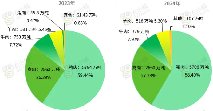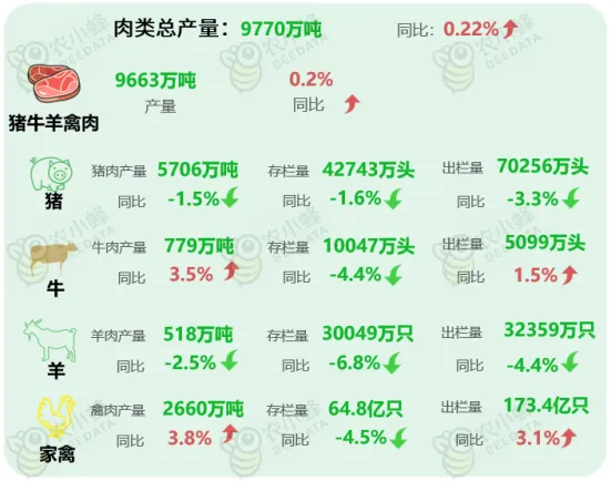 报告数据显示,中国肉类生产结构正在发生微妙变化。虽然猪肉产量(5706万吨)仍占据半壁江山(58.4%),但禽肉(2660万吨,占比27.23%)、牛肉(779万吨,占比7.97%)和羊肉(518万吨,占比5.3%)的比重正在稳步提升。这种“猪>禽>牛>羊”的格局虽然未变,但禽肉和牛肉的增速(分别同比增长3.8%和3.5%)明显高于猪肉(同比下降1.5%)。