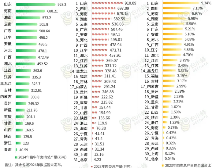 山东则是肉类生产的全能冠军,总产量稳居全国首位(2024年为928.3万吨),且禽肉产量独占全国近20%。