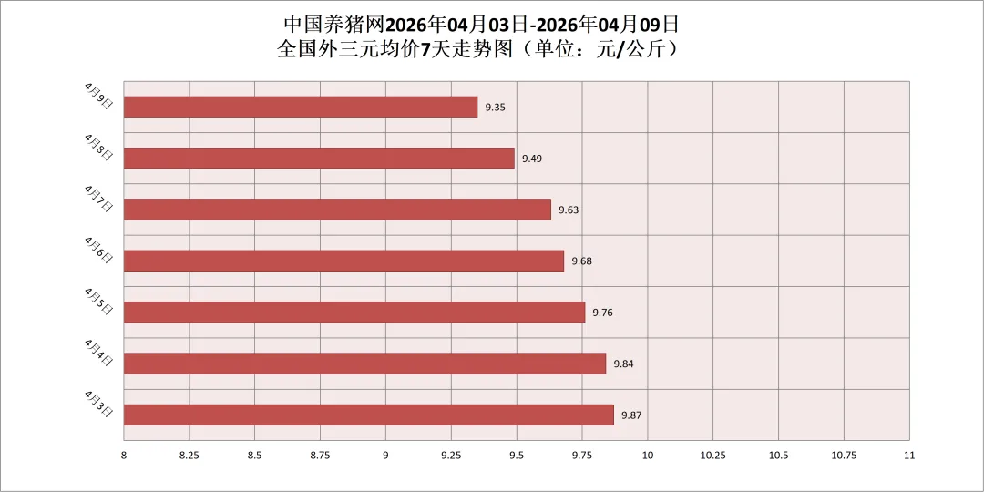 2026年04月09日(星期四),据中国养猪网猪价系统监测,全国外三元均价为9.35元/公斤,猪价较昨日(9.49元/公斤)下跌0.14元/公斤,较上月(10.37元/公斤)下跌了1.02元/公斤。