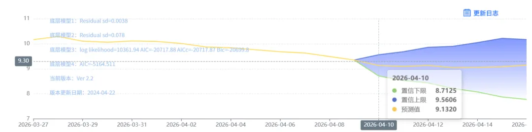 玄田算法是由项目课题组团队原创的非经典逻辑数值聚合理论和不确定性预测方法,构建了基于一致模算子的生猪价格预测模型。该模型采用的聚合函数及一致模相关理论与方法已获得多项国家自然科学基金和省级自然科学资金资助,并获得多项省级自然科学奖奖项。04月10日预测猪价为9.1320,置信区间在8.7125--9.5606之间。04月11日预测猪价为9.0963;04月12日预测猪价为9.1360。