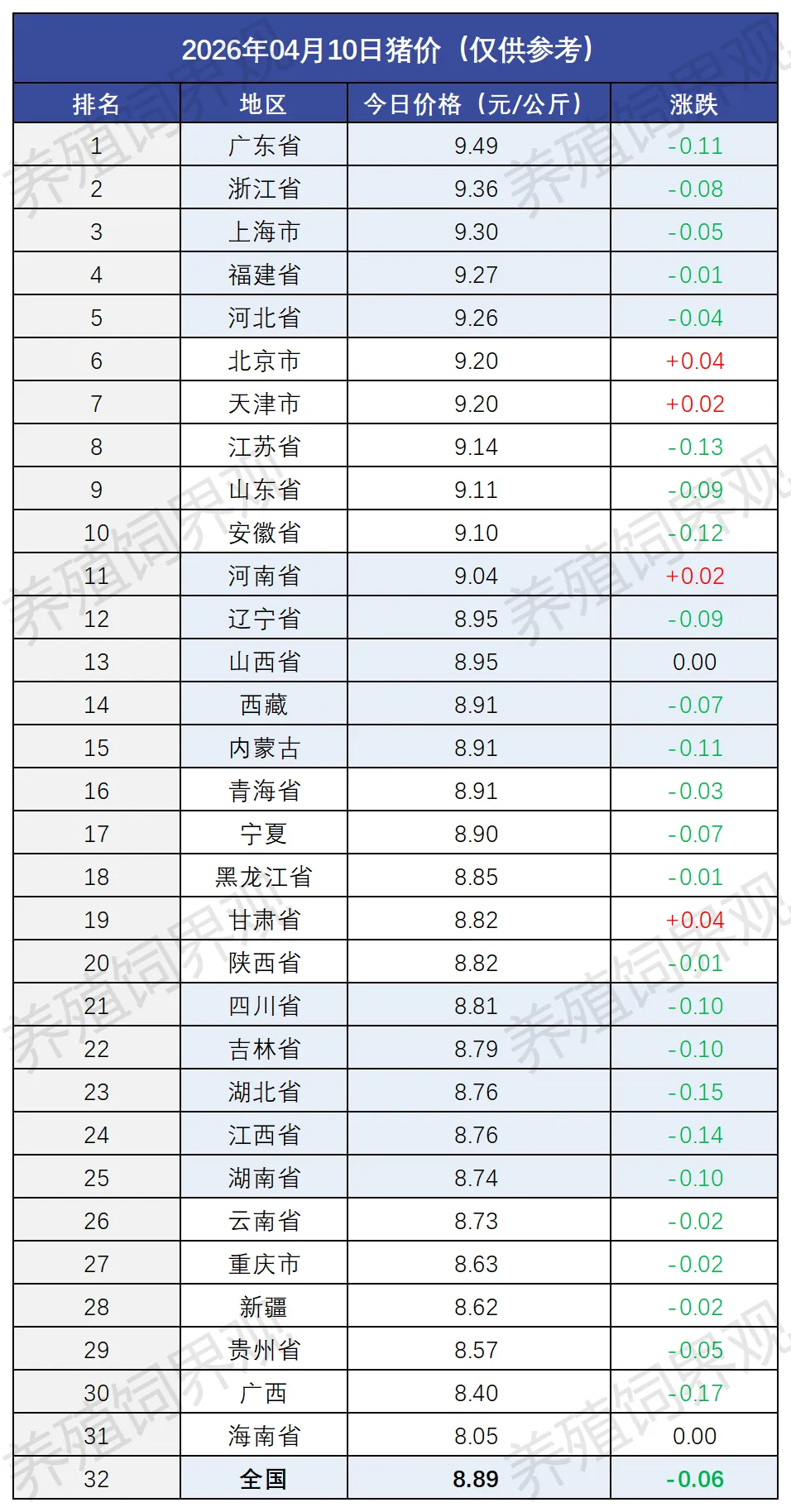 数据显示,4月10日,全国外三元生猪平均价格为8.89元/公斤,较昨日下跌0.06元/公斤。