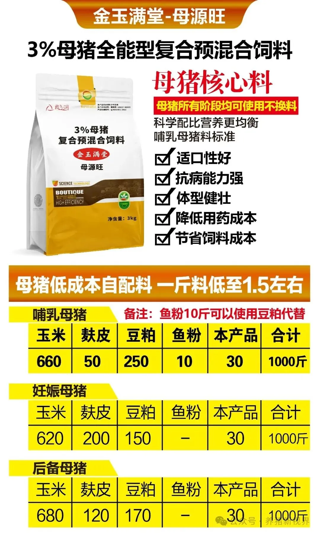 母猪所有阶段均可使用不换料,节省饲料成本 母猪低成本自配料,一斤料低至1.5元左右。